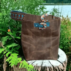 Gorgeous Old Towne Buckskin leather bucket bag featuring turquoise buckle accents on the bag and strap. Supple calfskin lace in Grulla and Turquoise provide stunning contrast to this luscious leather bag. One of a kind! LOVE IT! OWN IT!!