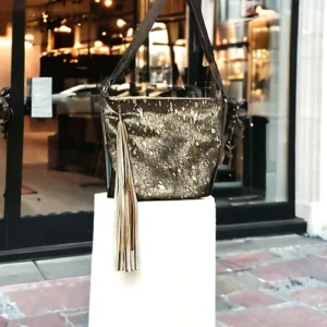 Are you a trendsetter, a woman with a certain je nais se quois, a fashion icon??? This Paradise Convertible is for you. Captivating gold tipped shimmer metallic hair on hide with gold acid wash marks you as a fashion maven! Buttery soft platinum Italian leather on the back features a handy slip pocket for your phone and a concealed carry pocket.