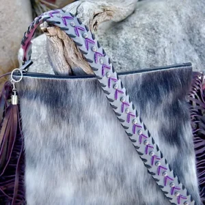 Iconic western fashion featuring hand cut 18" fringe! RARE, EXOTIC! This gorgeous Brazilian cowhide panel is both rare and exotic, just like you! Features include an interior leather patch pocket and an interior zippered pocket. The oversize crossbody strap features iron spots and contrasting whip stitching. This is ONE GORGEOUS BAG!