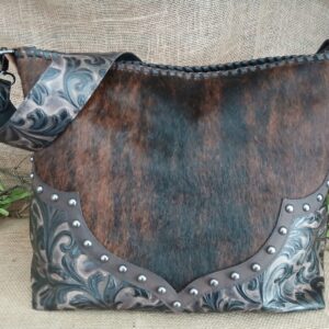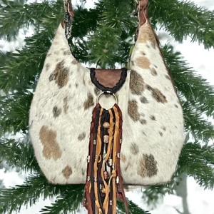 Boho Hobo Fjord Bag, a custom leather bag that embodies the free-spirited bohemian style. The bag features a hair on hide Brazilian Tricolor exterior and a buttery soft Whiskey distressed leather back for a unique and rustic look. The metallic shimmer lining in funky and fabulous mint paisley swirl adds a touch of glam to the bag. The cool flapper closure with sparkly glass and metal beads perfectly complements the Boho vibe. The bag also includes an interior slip pocket and ample room for everything you carry, making it both functional and stylish. Get ready to receive compliments wherever you go with this chic and trendy bag.