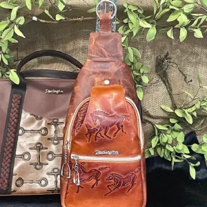 PROCLAIM your passion for all things Equestrian! One of a kind and available now! Crafted from supple, soft leather featuring embossed horses and exotic water buffalo in antique copper.