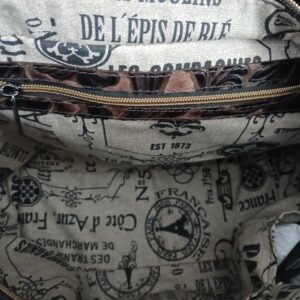 A classic zipper top tote with a twist! Gorgeous water buffalo in striking tones of turquoise and silver with braided straps. The exterior features a full length zipper pocket on the front and a generous slip pokcet on the back. The interior liner features 3 oversize pockets on both sides! Organization galore and easy visibility accented by the adorable dog print. One of a kind and available now.